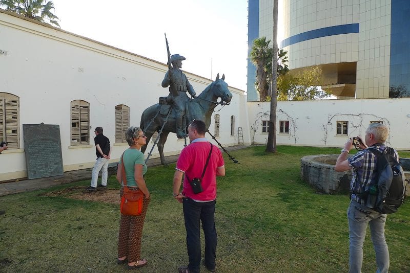 “The first concentration camps on earth were built in this part of Africa… They were built by the British Empire in South Africa and by Germans here, in Namibia. Shark Island on the coast was the first concentration camp in Namibia, used to murder the Nama people, but now it is just a tourist destination – you would never guess that there were people exterminated there. Here in the center of Windhoek, there was another extermination camp; right on the spot where “The Horse” originally stood.”