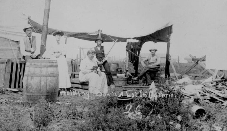 Oklahoma, 1890s. A mass of propertyless whites wait by the land office to register their claims. (Click on image)