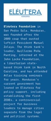 Over the years, Atlas and its affiliated charitable foundations have provided hundreds of grants to conservative and free-market think tanks in Latin America, including the libertarian network that supported the Free Brazil Movement and organizations behind a libertarian push in Argentina, including Fundación Pensar, the Atlas think tank that merged with the political party formed by Mauricio Macri, a businessman who now leads the country. The leaders of the Free Brazil Movement and the founder of Fundación Eléutera in Honduras, an influential post-coup neoliberal think tank, have received financial support from Atlas, and are among the next generation of political operatives that have gone through Atlas’s training seminars.