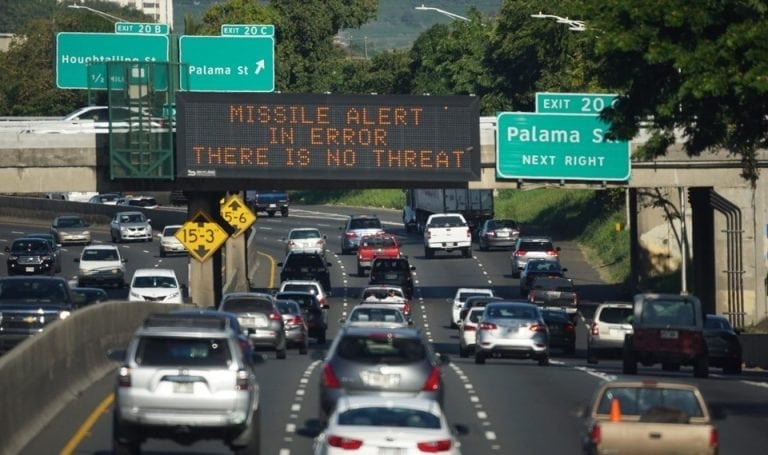[su_dropcap style=”light” size=”5″]T[/su_dropcap]he “false alarm” delivered to a population of 1.5 million in the US Pacific island state of Hawaii on Saturday morning has laid bare the clear and present danger of a nuclear war.Cell phones lit up with the text message “BALLISTIC MISSILE THREAT INBOUND TO HAWAII. SEEK IMMEDIATE SHELTER. THIS IS NOT A DRILL.” Television and radio broadcasts were interrupted with the chilling announcement that “A missile may impact on sea or land within minutes. This is not a drill.”