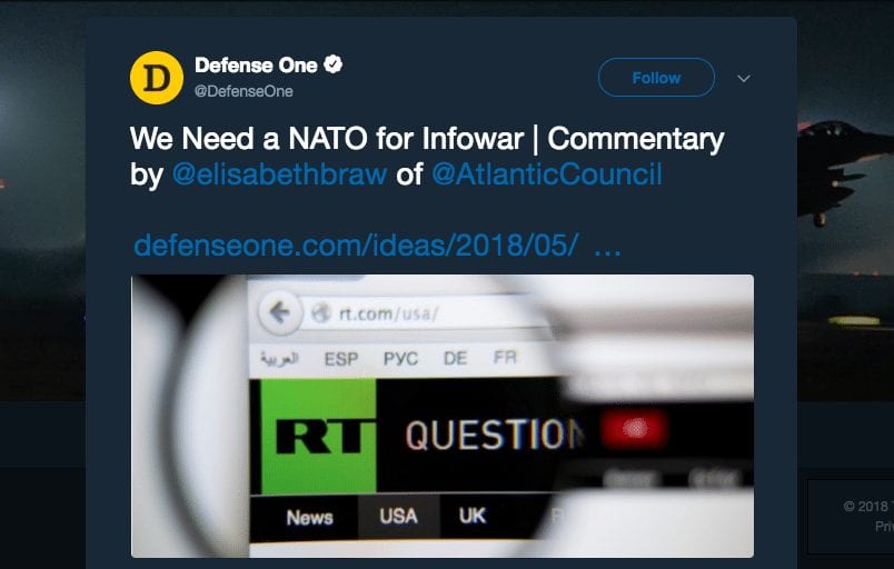 Before I continue, I should note that Braw is a Senior Fellow at the Atlantic Council, the shady NATO-aligned think tank with ties to powerful oligarchs whose name comes up when you look into many of the mainstream anti-Russia narratives, from the DNC hack to the discredited war propaganda firm Bellingcat to Russian trolls to the notorious PropOrNot blacklist publicized by the Washington Post. Her article, published by Defense One, is titled “We Need a NATO for Infowar”, and it argues that westerners need to be propagandized by an alliance of western governments for our own good.