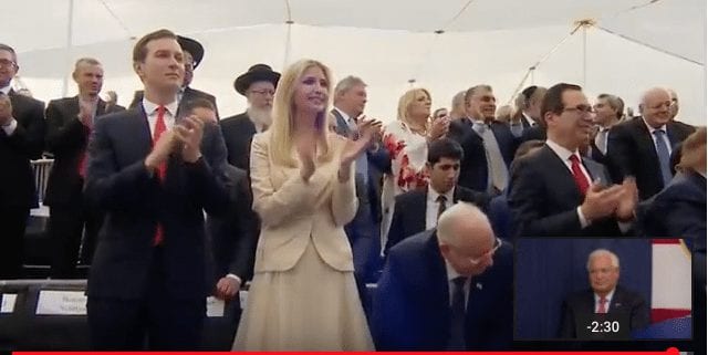 Privileged First Daughter Ivanka Trump listening to her hubby bloviate during US Jerusalem Embassy inauguration. An orgy of self-congratulatory double speak while real Palestinian blood flows in Gaza and the West Bank.