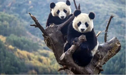 Two captive pandas strike a pose on a tree in their habitat in Southwest China’s Sichuan Province. Photo: Courtesy of the Chengdu Research Base of Giant Panda Breeding