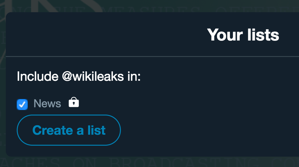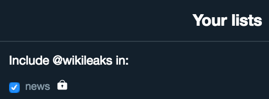 I check the box to include WikiLeaks in my list, close the box, and now I’ve got a list with one member in it which I can access by selecting “lists” from the Twitter menu. The little lock symbol indicates that it’s a private list. I can remove WikiLeaks from my list at any time by going to their page, selecting “Add or remove from lists” again, and simply un-checking the blue box.I’ve got 71 accounts in my list now, and when I click on it I get a straightforward, chronologically ordered feed of only sharers of quality information: