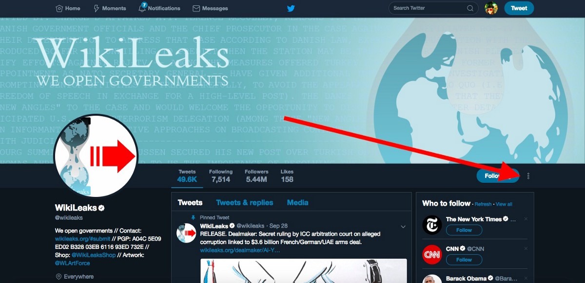 After you’ve got a Twitter account, use the search bar to find the individual voices you trust. I’ll use WikiLeaks and a desktop browser as an example. Go to their page and click the three vertical dots on the far right near the top: