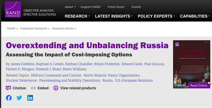 The Rand Corp prides itself on having contributed to the elaboration of the long-term strategy which enabled the United States to win the Cold War, by forcing the Soviet Union to consume its own economic resources in the strategic confrontation. It is this model which was the inspiration for the new plan, Overextending and Unbalancing Russia, published by Rand [1].
