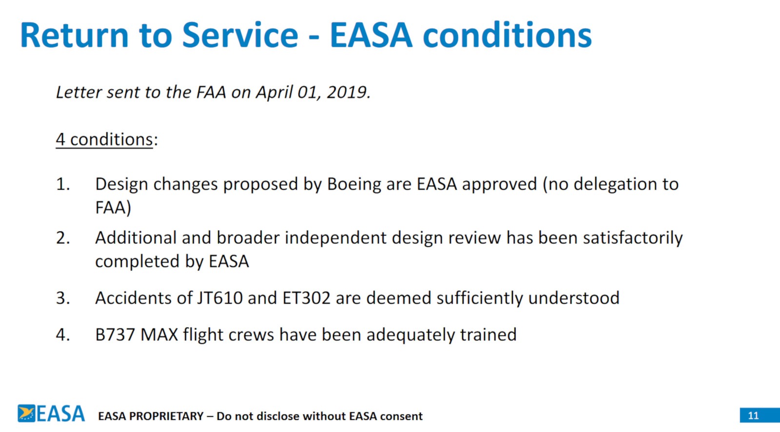 As a consequence of Boeing’s unwillingness EASA went public with its demands by putting them into the above presentation. Even under political pressure there is no way EASA can now go back on them.