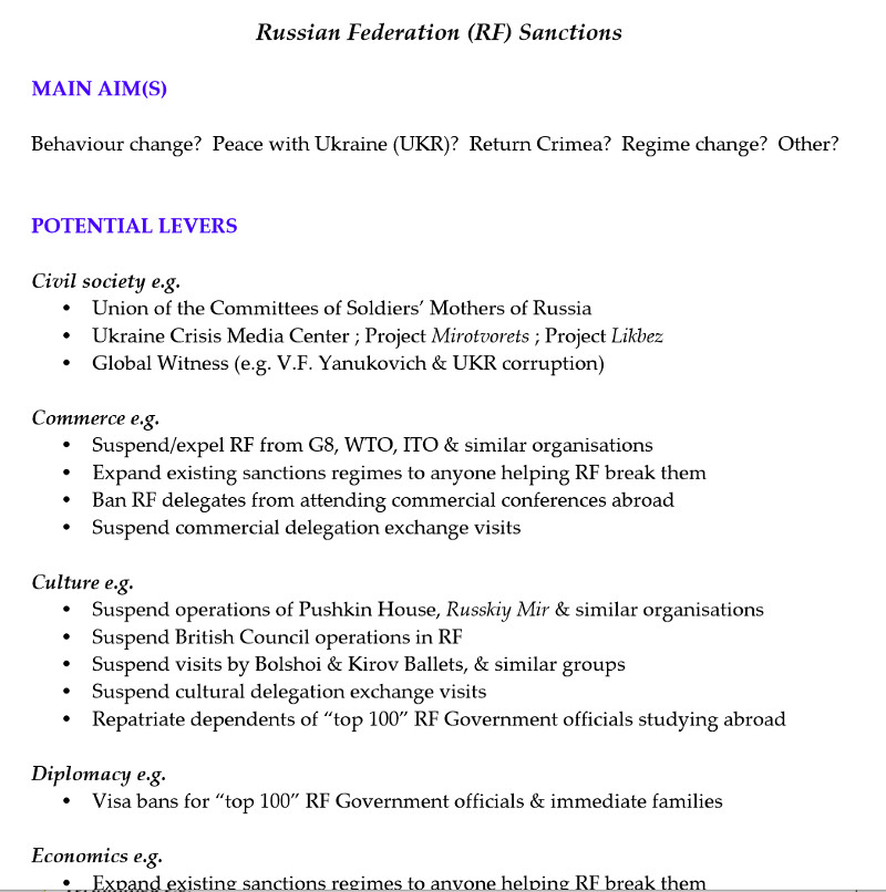 There have been seven releases of Institute of Statecraft documents. They included proposals for large anti-Russian disinformation campaigns. The Institute of Statecraft suggested to impose anti-Russian sanctions as early as January 2015. Its head, the former NATO advisor and military spy Chris Donnelly, also proposed to synchronously expel a large number of Russian diplomats from western countries.