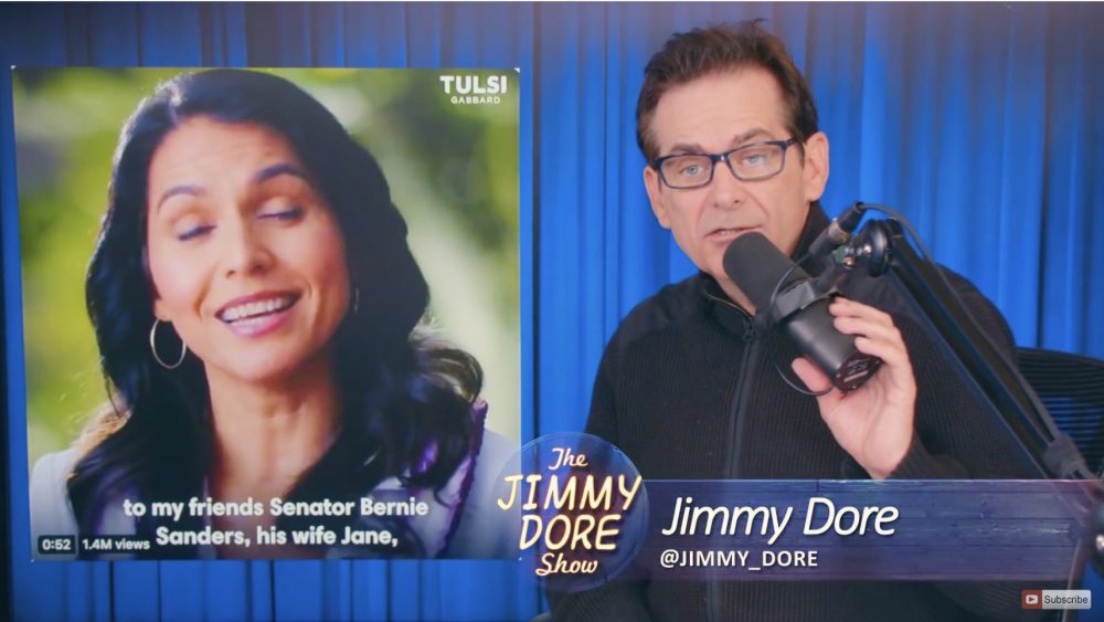 [su_panel background=”#fefefe” color=”#181515″ border=”7px groove #0939e8″ shadow=”2px 1px 4px #eeeeee” radius=”11″]Maybe out of pride, or lingering loyalty, Jimmy Dore is belatedly filing a video in which he still struggles to find excuses for Tulsi’s actions. We all feel betrayed, Jimmy. But, as YouTube commenter so aptly says, you must stop “twisting like a pretzel to defend her.” Another viewer, equally spot on (Donna Gray) adds, “At least Tulsi has shown her true colours. Jimmy you need to let her go. Give yourself 48 hours to grieve and get back into jag off mode.” They are all right, of course. Painfully right, even if this latest slap in the face for many of those who held minimum hope of relief via the existing setup did not come entirely as a surprise. [/su_panel]