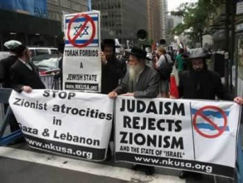 Neturei Karta adherents demonstrating against Israeli oppression of Palestinians.
