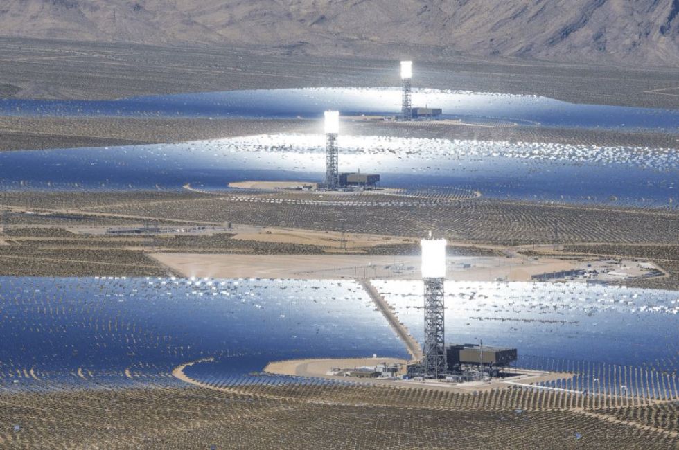 The Ivanpah solar thermal plant and its three power towers spans across the Mojave Desert