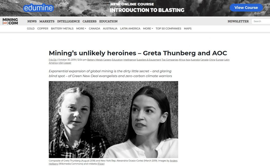 Even mainstream environmentalists acknowledge that rising reliance on renewable energy “means a lot of dirty mining” to extract the minerals required for electric batteries and solar cells. This prospect has sparked excitement within the mining industry, with the editor of Mining.com, Frik Els, dubbing Green New Deal spokeswomen Rep. Alexandria Ocasio-Cortez and Greta Thunberg “mining’s unlikely heroines.”
