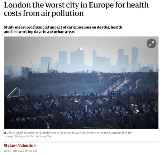 The latter story, based on new research, specifically assessed the cost of air pollution in European cities – in terms of “premature death, hospital treatment, lost working days and other health costs” – at £150 billion a year. Most of this was caused by pollution from vehicles, the profitable product of the car industry. The researchers admitted that their figure was an under-estimate of air pollution’s true cost.