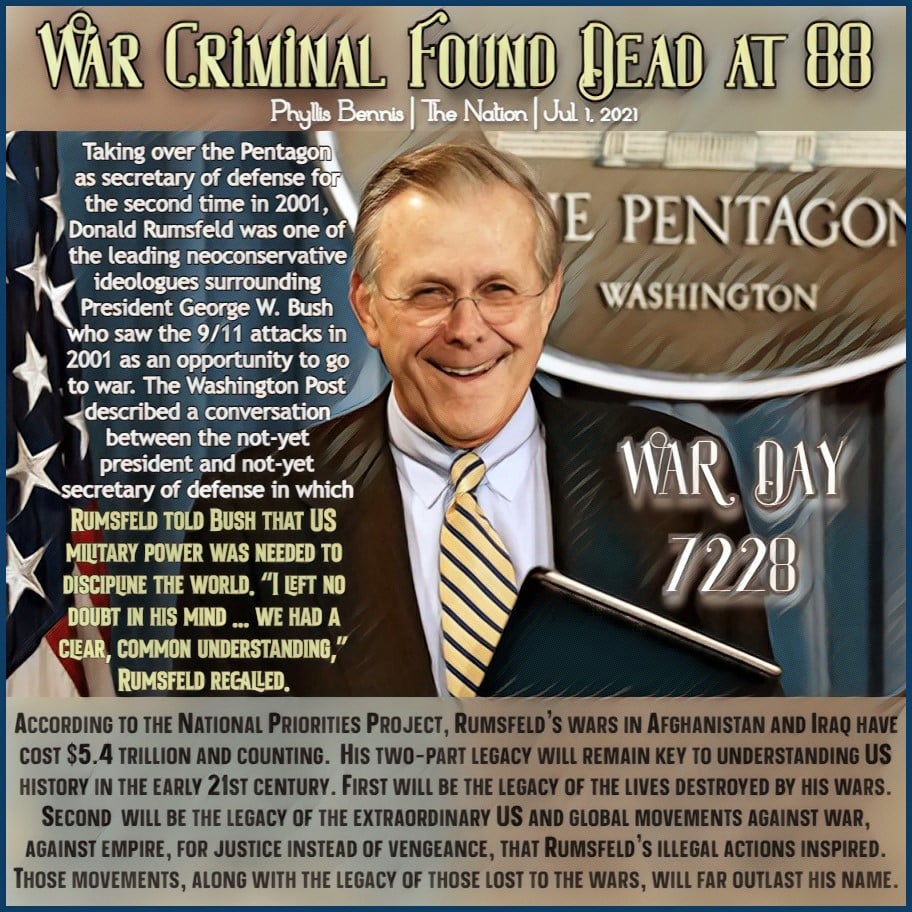 Rumsfeld’s two-part legacy will remain key to understanding US history in the early 21st century. The first part will be the legacy of the lives destroyed by his wars. The second part will be the legacy of the extraordinary US and global movements against war, against empire, for justice instead of vengeance, that Rumsfeld’s illegal actions inspired. Those movements, along with the legacy of those lost to the wars, will far outlast his name.