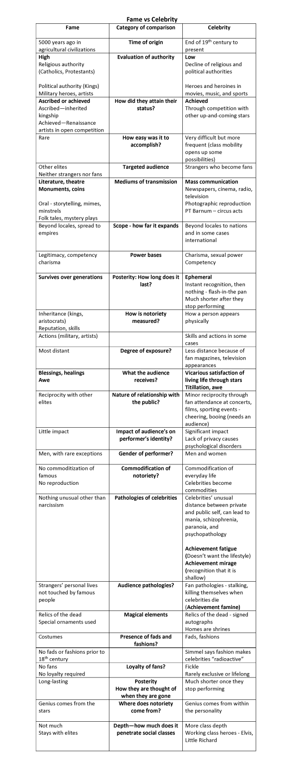 From my research into two books, The Frenzy of Renown: Fame and Its History by Leo Braudy and Celebrity by Chris Rojek, I found some interesting differences between what it means to be famous what it means to be a celebrity. What both forms of notoriety have in common is their relationships with the public: