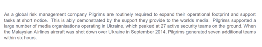 “As a global risk management company Pilgrims are routinely required to expand their operational footprint and support tasks at short notice,” the proposal bragged. “Pilgrims supported a large number of media organisations operating in Ukraine, which peaked at 27 active security teams on the ground. When the Malaysian Airlines aircraft was shot down over Ukraine…Pilgrims generated seven additional teams within six hours [emphasis added].”