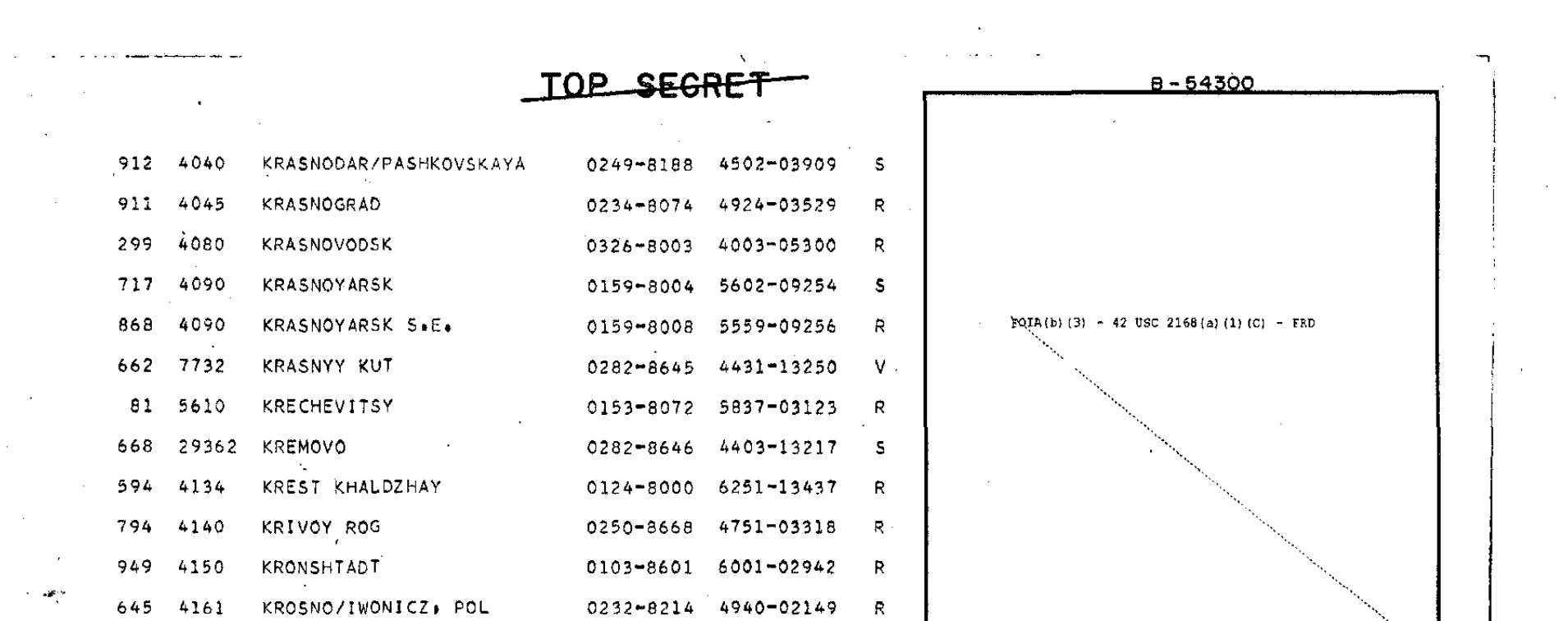 Excerpt from list of the 1200 cities targeted for nuclear attack in alphabetical order. National Security Archive, op. cit.