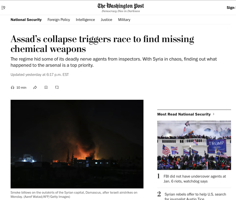 On 12 December 2024, the Washington Post (one of the top liars against Saddam Husein) headlined “Assad’s collapse triggers race to find missing chemical weapons”, and reported