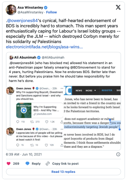 But after Israel’s most recent war against Palestinians in Gaza last year – and the subsequent global upsurge in BDSand decline in support for Israel – he did a classic Owen Jones flip-flop and suddenly declared his support for the boycott.