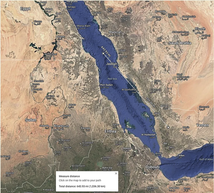 From a launch point in Yemen, it would require over an hour of flight time to travel the 1000+ km distance to the carrier strike group in the northern Red Sea.