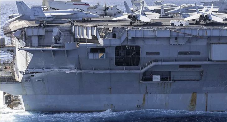 The “official” story is that an F/A-18 and its tow tractor were flung overboard while performing “evasive maneuvers” in the face of oncoming Yemeni anti-ship cruise missiles.