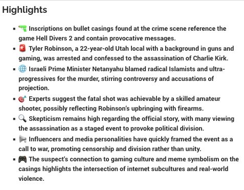 The video transcript discusses the assassination of Charlie Kirk, founder of Turning Point USA, and the arrest of the suspect, Tyler Robinson, a 22-year-old from Utah. It explores the suspicious circumstances around the shooting, including unusual inscriptions on bullet casings linked to a video game, and skepticism about the official narrative. The discussion includes political implications, with Israeli Prime Minister Benjamin Netanyahu blaming radical Islamists and “ultra-progressives” for the murder, a claim met with criticism for hypocrisy. The video also touches on the broader context of political violence, media manipulation, and societal division in the United States, highlighting concerns about orchestrated operations and the use of tragedy to fuel censorship and further polarization. Additionally, the video calls attention to the influence of internet and meme culture on modern shooters, noting the suspect’s apparent connection to gaming subcultures and online radicalization. The conversation ends with reflections on the desensitization to violence, the role of government and intelligence agencies in creating shooters, and warnings regarding the exposure of youth to online content that may contribute to radicalization.