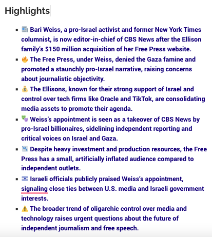 ️♂️ Conflict of Interest and Editorial Integrity: The significant conflicts of interest surrounding Weiss—financially backed by tech and AI billionaires with ties to pro-Israel lobbying and controversial government policies—undermine CBS News’s claim to impartiality. Maintaining editorial control of the Free Press while leading a legacy news organization creates a dual platform that can channel biased narratives into mainstream media, blurring the lines between opinion activism and factual reporting.