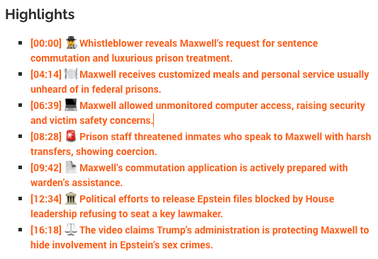 - [00:00] ️♂️ Whistleblower documents expose a covert operation protecting Maxwell: The leaked emails and internal reports strongly suggest Maxwell’s privileged prison treatment is part of a larger strategy to secure her silence and eventual sentence reduction. This raises serious questions about abuse of power within the DOJ and the Trump administration.