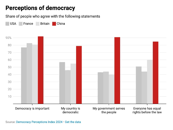 – Legitimacy of governance is achieved by delivery of real benefit to ordinary people – the Chinese government had > 90% approval rating according to Western surveys, eg by Harvard, which reflected real-world outcomes, eg, rising life expectancy, low cost of living, etc.