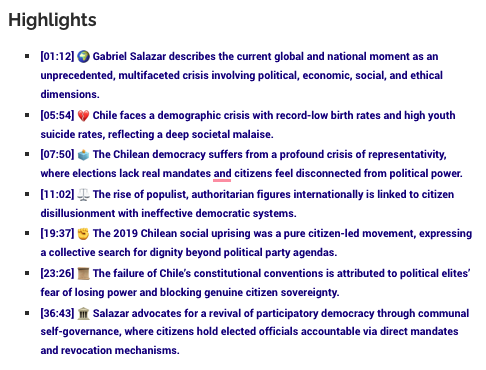 [23:26] 🏛️ Failure of Constitutional Reform Due to Elite Resistance: The political class’s fear of losing power led to the dilution and eventual failure of the constitutional conventions. Salazar highlights the contradiction between grassroots demands for popular sovereignty—embodied in proposals for binding communal assemblies—and the political elite’s maneuvers to maintain control through traditional electoral structures. This dynamic illustrates how institutional inertia and elite interests block democratic renewal, perpetuating systemic crises.