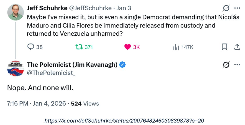 Anyone—especially any politician—who claims to oppose this abduction by the Trump administration but refuses to demand the immediate, unconditional release of the two abductees is just a virtue-signalling American imperialist, complicit in the crime.