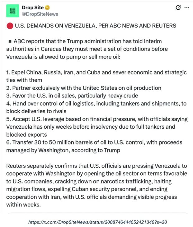 Color me cantankerous, but I can’t think of anything better for Venezuela to do than to ignore all of Trump’s delusions and demands. You’re still in control of the Venezuelan polity. Act like it! Make clear that if they want to take control from you, they will have to fight for it. Refuse any discussions until and unless Maduro and Flores are released; keep yourself, them, and the world focused on the illegitimacy and inadmissibility of their abduction; maintain the unity of the country as a force of armed resistance; increase military preparedness as much as possible; ask for help from all countries interested in joining your front-line defense of “international niceties” like, you know, Westphalian Sovereignty, that have been in place since the 17th century; continue to develop your economy any way you want and trade and do business with anyone you want.